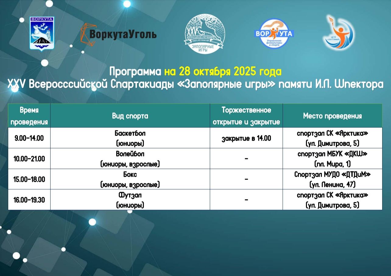 ПРОГРАММА XXV ВСЕРОССИЙСКОЙ СПАРТАКИАДЫ «ЗАПОЛЯРНЫЕ ИГРЫ» ПАМЯТИ И.Л. ШПЕКТОРА НА 28 ОКТЯБРЯ