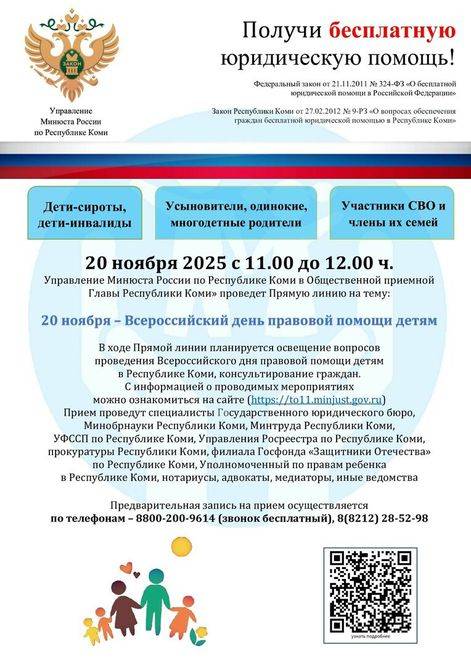 20 ноября 2025 г. с 11.00 до 12.00 в Общественной приемной Главы Республики Коми состоится Прямая линия на тему «Всероссийский день правовой помощи детям».