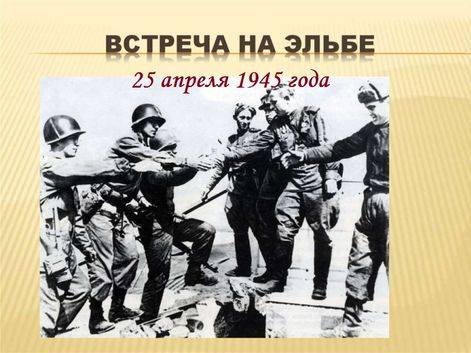 25 апреля 1945 года в 13:30 (мск) в районе г. Торгау на Эльбе произошла встреча советских и американских войск. Легендарная встреча на Эльбе стала высшей точкой в союзнических отношениях антигитлеровской коалиции.