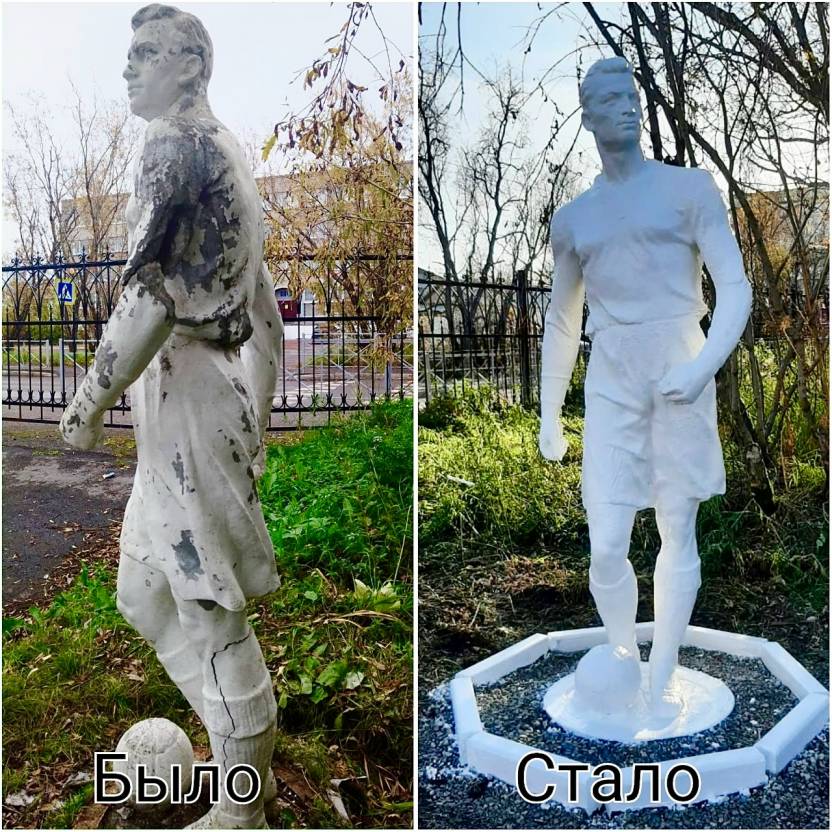 В городском парке работники муниципального предприятия восстановили «футболиста». Врио главы Воркуты Игорь Гурьев на своей странице показал, как выглядела скульптура до и после реставрации.