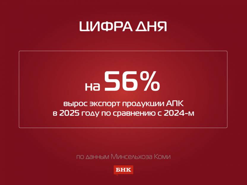 Как сообщили БНК в министерстве сельского хозяйства и потребительского рынка Коми, в республике реализуется региональный проект «Экспорт продукции АПК». Объем за 9 месяцев 2025 года в ведомстве не назвали, но подчеркнули, что по сравнению с аналогичным периодом 2024-го он вырос на 56%. Считается, что поставки продукции агропромышленного комплекса «развиваются опережающими темпами».