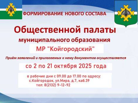 В соответствии с Федеральным законом от 21 июля 2014 года №212-ФЗ «Об основах общественного контроля в РФ», решением Совета МР «Койгородский» от 30 апреля 2025 года №VI-41/370 «Об утверждении Положения об Общественной палате муниципального образования муниципального района «Койгородский»» администрация муниципального района «Койгородский» уведомляет о начале процедуры формирования нового состава Общественной палаты муниципального образования муниципального района «Койгородский» (далее – Общественная палата).