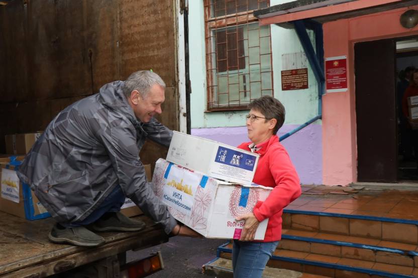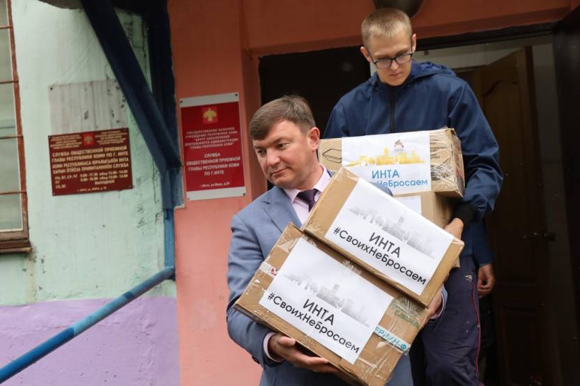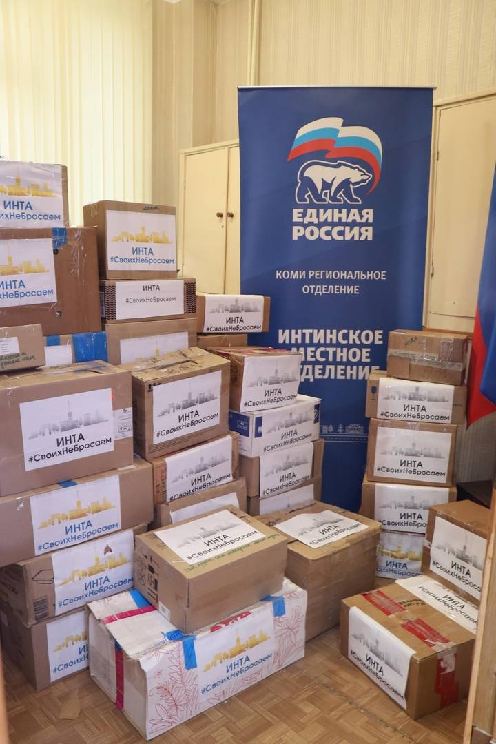 В Инте гуманитарную помощь принимают в местном отделении партии «Единая Россия». С весны кабинет не пустует — повсюду коробки с товарами первой необходимости, продуктами.