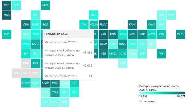 По итогам 2021 года Коми занимала 44-ю строчку рейтинга, набрав 40,622 балла, но в 2022-м улучшила позиции — поднялась на 39-е место с показателем 43,486 балла.