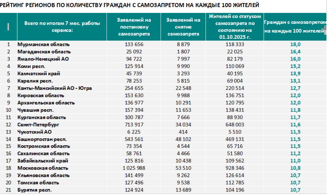 Рейтинг регионов по доле граждан с самозапретом возглавила Мурманская область: на каждые 100 жителей региона приходится 18 человек с действующим самозапретом на кредиты. В тройку лидеров данного рейтинга вошли также Магаданская обл. и Ямало-Ненецкий АО – в этих регионах самозапрет установлен у 16 жителей из 100. Коми находится на 4-м месте, где самозапрет установлен у 15 жителей из 100. Всего услугу подключили 110 тысяч человек.