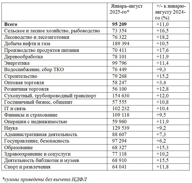 За январь-август средний размер зарплаты составил 95,2 тысячи — на 11% больше, чем за аналогичный период прошлого года (в реальном выражении — на 1,5% больше).