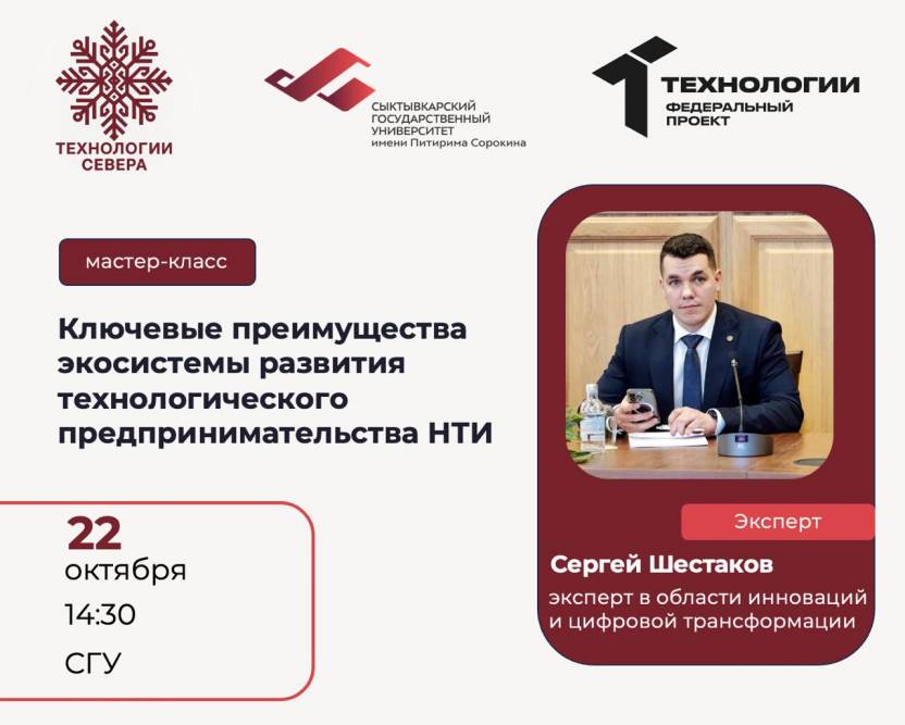 22 октября в 14.30 в рамках акселерационной программы «Технологии Севера» состоится Мастер-класс " Ключевые преимущества экосистемы НТИ "