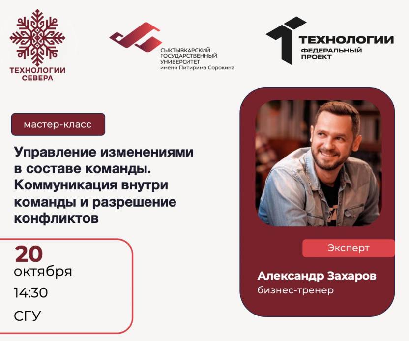 20 октября в 14.30 в рамках акселерационной программы «Технологии Севера» состоится Мастер-класс "Управление изменениями в составе команды. Коммуникация внутри команды".