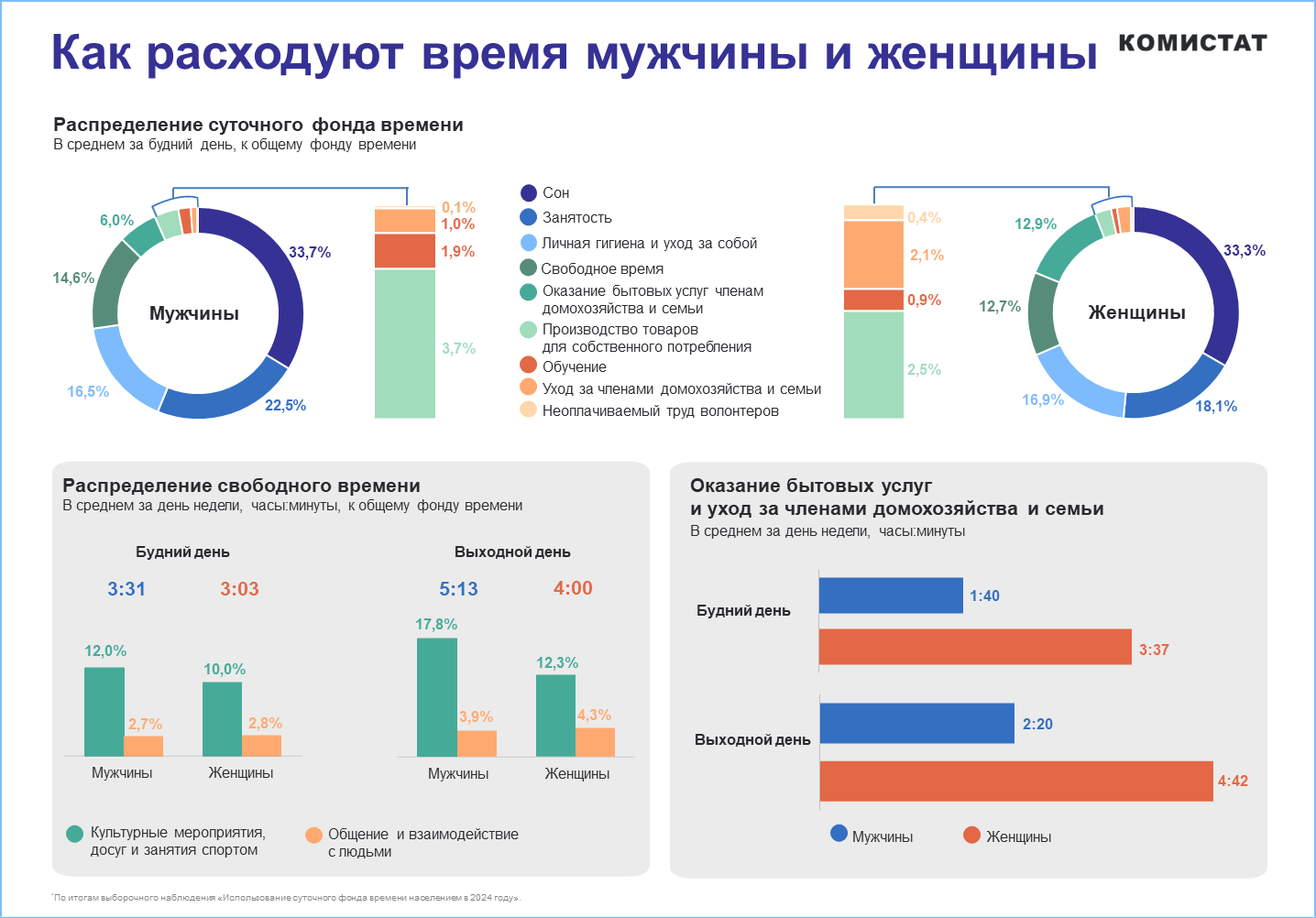 Вне работы женщины значительно больше времени посвящают домашним делам. В будний день на ведение хозяйства, уход за членами семьи и воспитание детей женщины уделяли в среднем 3 часа 37 минут, что составляет 15,1% от суточного фонда времени. У мужчин на это уходило на 2 часа меньше, или 6,9%. В выходные дни время, отведенное семейным делам, увеличивается: у женщин до 4 часов 42 минут, а у мужчин — до 2 часов 20 минут.