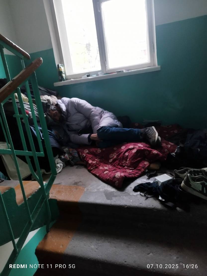 Как сообщалось ранее на БНК, в подъезде дома №77 на улице Коммунистической в Сыктывкаре уже несколько месяцев живет мужчина. По словам одной из соседок, как только стало холодно, он начал приносить и складировать на лестничной клетке вещи из мусорных контейнеров. Например, в его «коллекции» — влажные салфетки, провода, обувь, бутылка воды, множество зажигалок, наушники.
