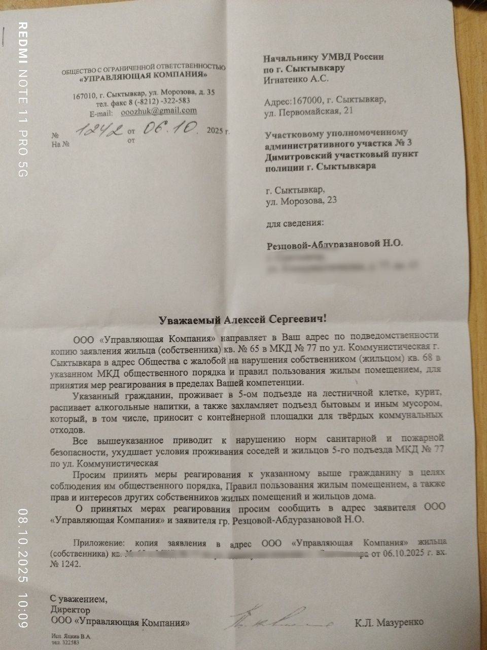 Утром 8 октября Надежда Резцова-Абдуразакова выложила в соцсеть обращение управляющей компании к начальнику УМВД по Сыктывкару Алексею Игнатенко; документ для сведения также отправили и ей. В нем указано, что мужчина, проживающий в подъезде, курит, распивает алкоголь, захламляет лестничную клетку бытовым мусором. Это приводит к нарушению норм санитарной и пожарной безопасности и ухудшает условия проживания. В итоге УК попросила «принять меры реагирования к указанному гражданину в целях соблюдения им общественного порядка».