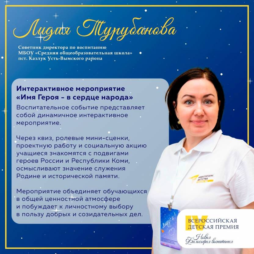 Лидия Турубанова, советник директора во воспитанию школы п.Казлук, – победитель всероссийского этапа заочного тура конкурса на присуждение IV Всероссийской детской премии «Новая философия воспитания» в номинации «Навигатор детских открытий».