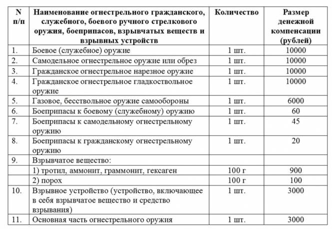 В соответствии с постановлением Правительства Республики Коми от 19.04.2013 № 123 «О мерах по реализации Закона Республики Коми «О денежной компенсации за добровольно сданное огнестрельное оружие, боеприпасы, взрывчатые вещества и взрывные устройства» установлены следующие выплаты: