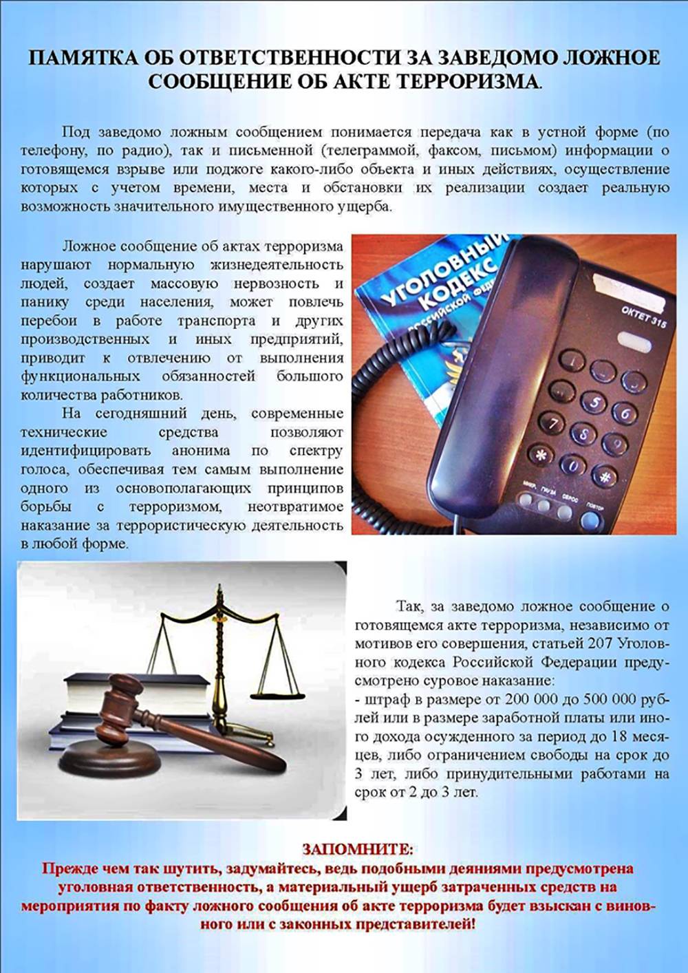 Памятка об ответственности за заведомо ложное сообщение об акте терроризма