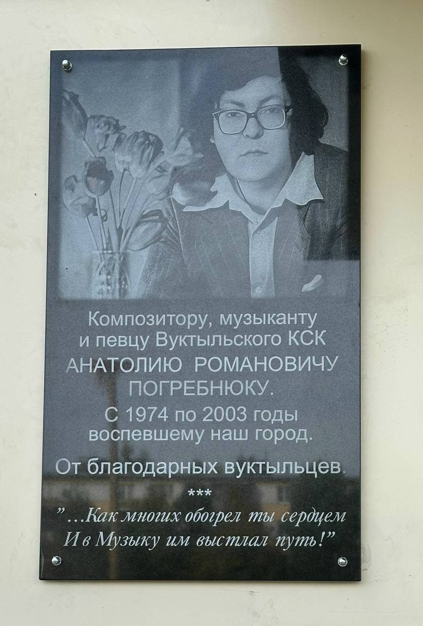 В муниципалитете открыли памятную доску Анатолию Погребнюку, чье имя «навсегда вписано в культурную историю Вуктыла», заявила Наталья Новикова. По ее словам, Анатолий Романович был не просто талантливым композитором и исполнителем, но и душой праздника, голосом города, «человеком, чья музыка дарила людям радость, тепло и надежду». Памятная доска установлена на входной группе клубно-спортивного комплекса, где не раз звучал его голос, проходили концерты, творческие встречи, праздники.