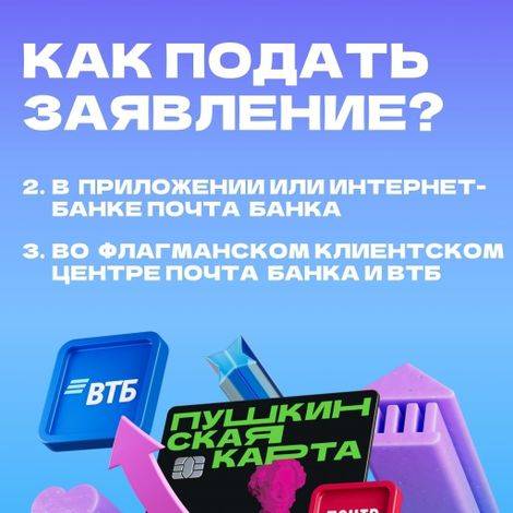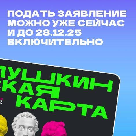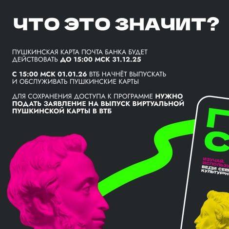 С 1 января 2026 года программа «Пушкинская карта» будет обслуживаться ВТБ Банком. Чтобы получить новую Пушкинскую карту, нужно до 28 декабря подать заявление на выпуск.