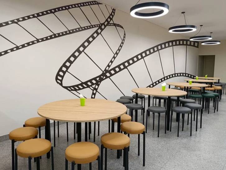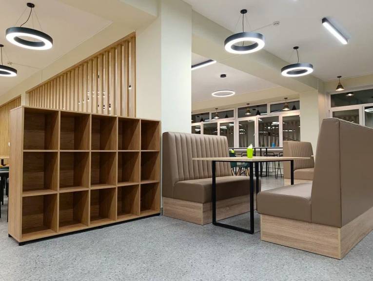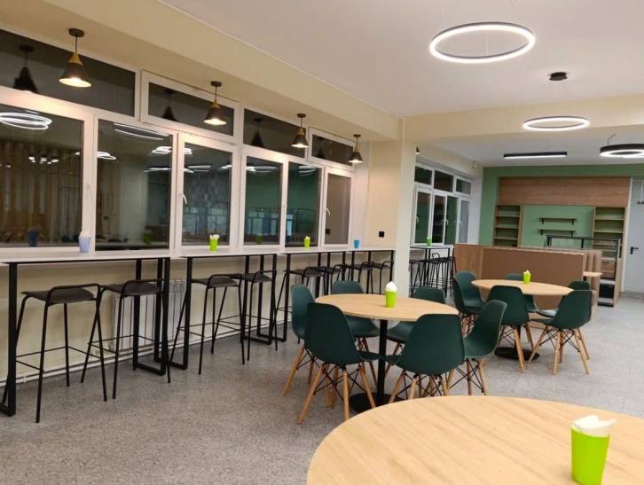 Открытие состоялось в сентябре. Кафе заменило привычный зал столовой. В отремонтированном зале установили столы, в том числе с мягкими диванами и у окон, облагородили зону для мытья рук, оборудовали специальные шкафчики для учащихся.