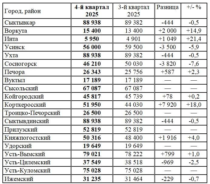 В семи муниципалитетах стоимость увеличится, в семи — уменьшится. Самое значительное изменение в денежном выражении произойдет по Корткеросскому району (плюс 7920 рублей), Сосногорску (плюс 3820 рублей) и Усинску (минус 3500 рублей).