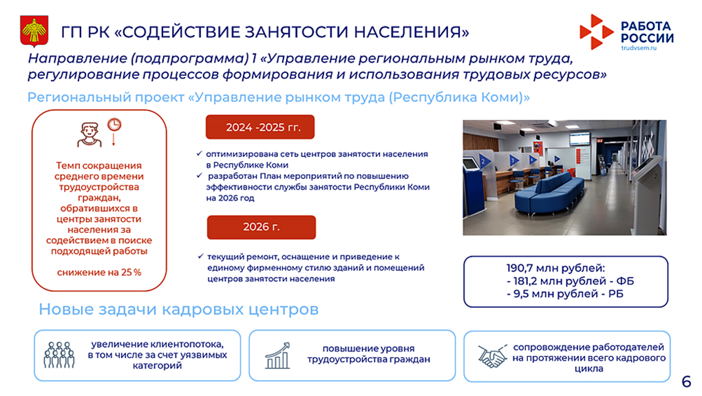 Для повышения эффективности работы службы занятости Коми в рамках регионального проекта «Управление рынком труда» нацпроекта «Кадры» в республике ведется работа по модернизации учреждений занятости населения. При субсидировании федерального бюджета предусмотрены текущий ремонт, оснащение и приведение к единому фирменному стилю зданий и помещений учреждений занятости населения. Общий объем бюджетных ассигнований на эти мероприятия составит 190,7 млн рублей, из которых 181,2 млн рублей – средства федерального бюджета.