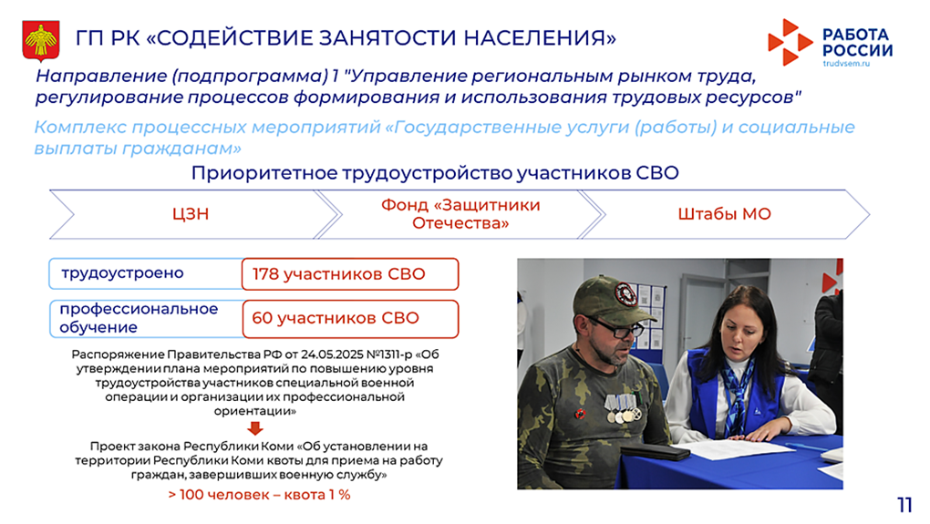 Для повышения уровня трудоустройства участников СВО и организации их профессиональной ориентации Минтрудсоц РК в соответствии с федеральным законодательством разработан проект республиканского закона «Об установлении на территории Республики Коми квоты для приема на работу граждан, завершивших военную службу». Он предполагает установление квоты трудоустройства участников СВО для работодателей со среднесписочной численностью работников более 100 человек. Сейчас этот проект закона проходит процедуру согласования.