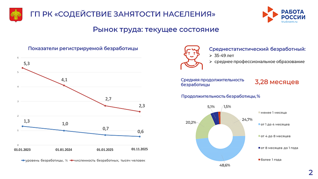 Говоря в целом о положении на рынке труда республики, Валерий Коротин сообщил, что уровень регистрируемой безработицы в Коми на 1 ноября составил 0,6 %. На учёте в центрах занятости в качестве безработных состоят 2,3 тысячи человек. Общее число заявленных работодателями региона вакансий составляет 8 тысячи единиц.