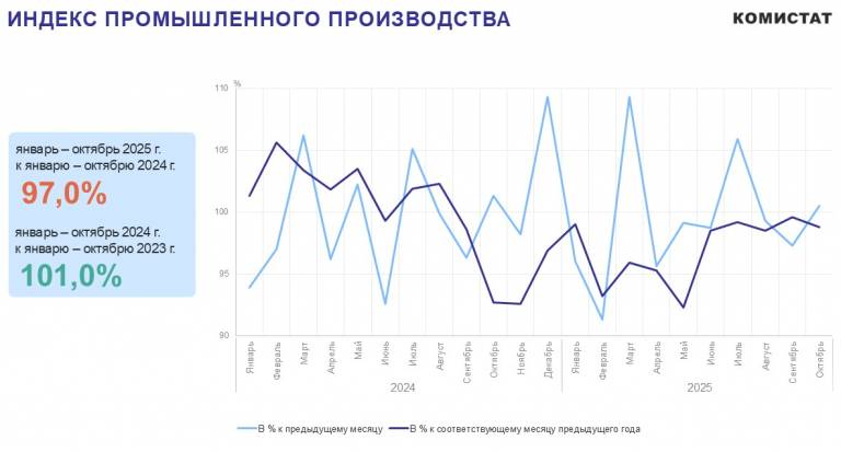 Как сообщает Комистат, индекс промышленного производства в январе-октябре 2025 года относительно аналогичного периода 2024 года составил 97%, то есть спад на 3% (в январе-октябре 2024 года был рост на 1%).