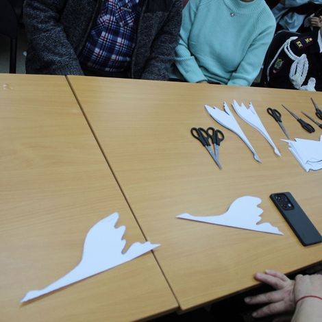 В конце мероприятия все участники вырезали белых журавлей, сделали белые самолётики, которые символично выпустили в небо ...