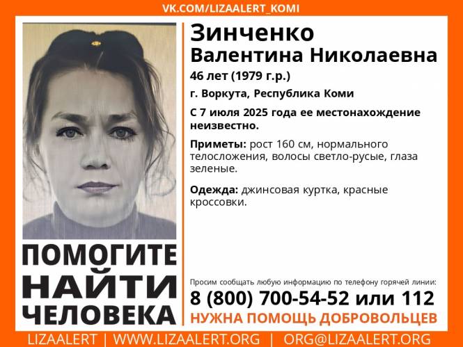 Как написал в соцсетях поисковый отряд «ЛизаАлерт», в Воркуте пропала Валентина Николаевна Зинченко 1979 года рождения. Ее местонахождение неизвестно с 7 июля.