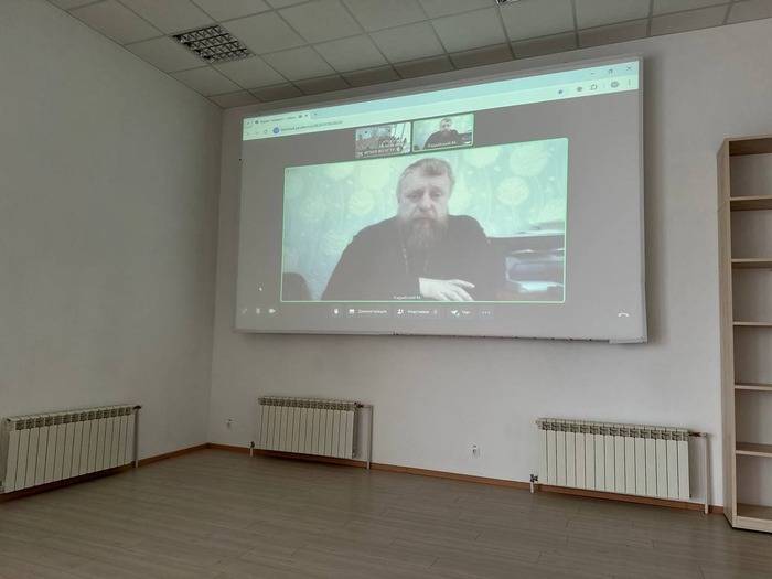 Первым к разговору в рамках телемоста подключился руководитель отдела по взаимодействию с Вооружёнными силами России Галичской епархии, настоятель храма святителя Николая в посёлке Кадый отец Павел Мотовичёв. Темами его выступления стали миссия и практика военного духовенства.