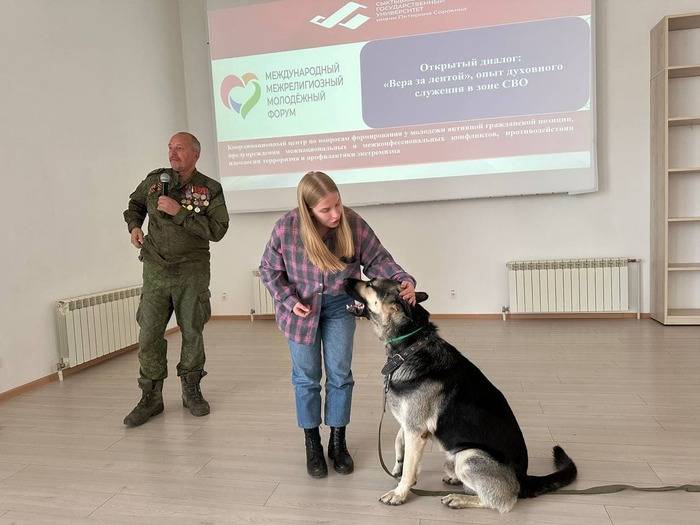 После речи священника слово взял участник СВО Андрей Мухин, который более двадцати лет проработал кинологом в системе МВД. Вместе с ним на встрече присутствовал его четырёхлапый спутник – восточноевропейская овчарка по кличке Черкес. Эта собака-сапёр дважды побывала в зоне боевых действий, а чтобы встретиться со студентами УГТУ пёс терпеливо преодолел путь из Сыктывкара в Ухту в составе команды Координационного центра университета. Черкес прямо на площадке продемонстрировал свои умения: Андрей припрятал учебную гранат, и пес безошибочно вычислил, откуда исходит опасность. Зрители не скрывали эмоций, а после завершения площадки «Открытый диалог» сделали фотографии с четвероногим героем.