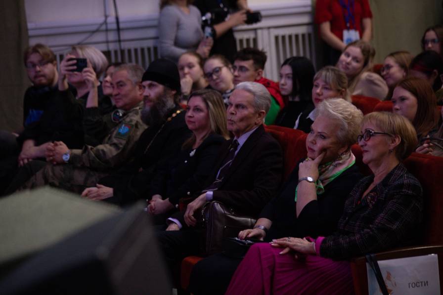 Встреча прошла при аншлаге – собравшихся было настолько много, что в зале пришлось выставлять дополнительные стулья. Но и их не хватало: слушатели стояли в проходах и у дверей. Среди присутствующих были студенты, преподаватели, ректор СГУ им. Питирима Сорокина Ольга Сотникова. Также на встречу пришли родственники погибших на СВО, православный батюшка Максим Стыров, доктор медицинских наук, профессор Юрий Солонин, а также студенты Республик Мордовии, Марий Эл, Удмуртии – финалисты Межрегионального конкурса военно-патриотической песни «Смуглянка».